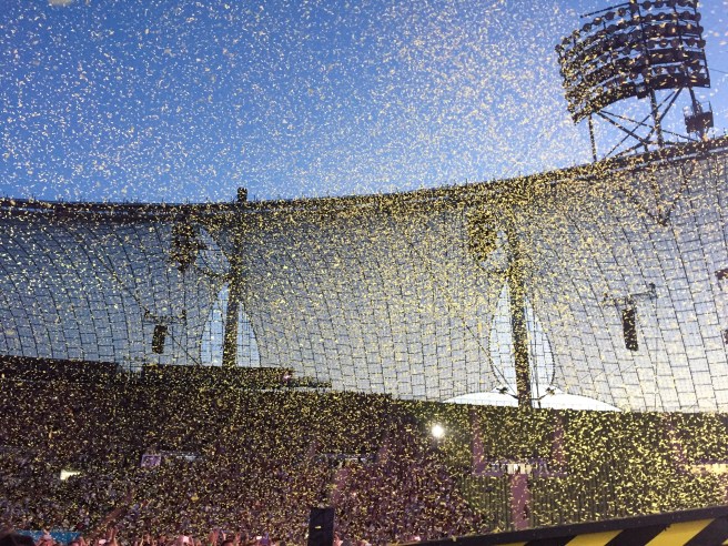 Kurz vor Mitternacht leert sich das Stadion und ich gehe an den Sitzplatzreihen vorbei. Für einen kurzen Moment flammt die alte Wut in mir auf. Es ist gut zu wissen, dass sie noch da ist. Wenn nötig, kann ich noch immer mein Leben binnen einiger Tage auf den Kopf stellen. Töpfe zerschlagend und mit einer Energie, die sonst verborgen ist, kann ich noch immer von vorne anfangen.  Irgendwann nach einem Neuanfang regnet es immer Flitter vom Himmel und im Magen vibrieren die Bässe. Es wäre nicht das erste Mal.
