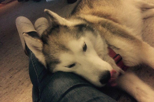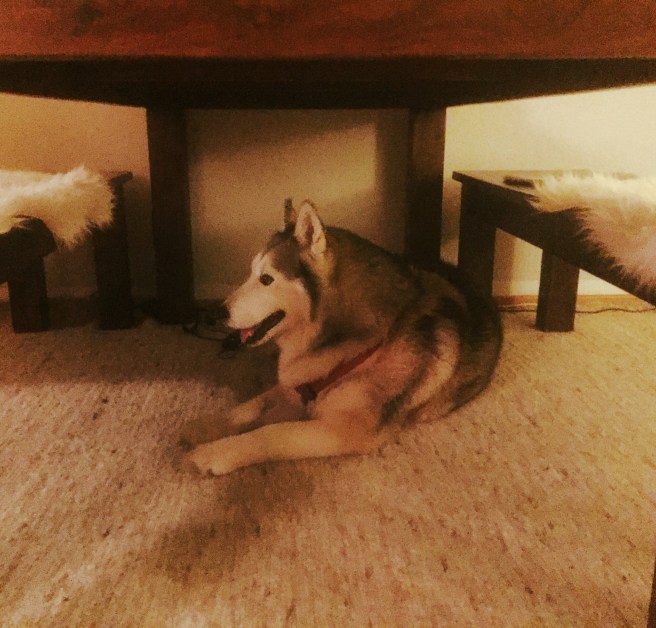 Ich liege unter dem Tisch. Nicht die ganze Zeit. Aber ab und zu. Denn das ist Tschukos aktueller Lieblingsplatz. Auf meinem Laminat rutschen ihm die Pfoten weg und dort ist einer der wenigen Plätze mit einem Teppich. Warm muss er es nicht haben. Als Husky ist er mir dankbar, dass ich die Heizung nicht ganz aufdrehe. Weil ich aber nicht frieren will, lege ich mich unter den Tisch, zu Tschuko. Er legt sich dicht vor mich, während ich lese und ich bin ganz froh, alleine zu wohnen. In meinem Alter ist es komisch, sich zum Lesen unter den Tisch zu legen. Tschuko und ich finden das völlig normal. Ab und zu leckt er mir über das Gesicht, wenn ich mich nicht schnell genug wegdrehe. Er weiß, dass ich das nicht mag und grinst mich dann an. Doch! Hunde können grinsen.
