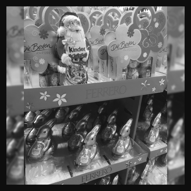 Ist es zu fassen? Zwischen all den Schokoladentechnisch unbrauchbaren Osterhasen, steht tapfer und etwas einsam ein Schokoweihnachtsmann meiner Lieblingssorte. Ich habe ihn gerettet.