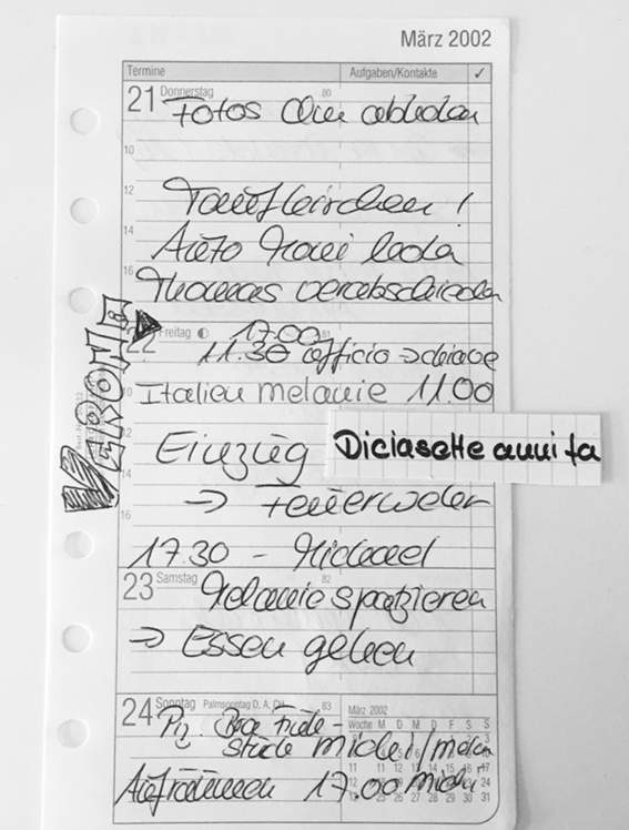 Mit dem Kalender in der Hand bleibe ich auf dem Boden sitzen, weil es nicht leicht ist aufzustehen, wenn man urplötzlich und mit ungeahnter Wucht 17 Jahre durch die Zeit geschleudert wird. Wenn die Eintragungen stimmen, und das tun sie immer, dann holte mich meine Freundin erst um 11.00 Uhr ab. Ich dachte es wäre früher gewesen. Jetzt aber erinnere ich mich, dass wir genau vor 17 Jahren um 16:12 Uhr kurz vor Verona auf der Autobahn waren. Während ich mich aus meiner Jacke schäle, klopft mein Herz ganz aufgeregt und es wundert mich nicht. Da ich gerade 17 Jahre zurück geflogen bin, ist es mein Herz natürlich auch und das hatte im Jahr 2002 ordentlich zu klopfen. Es fürchtete, dass wir den vereinbarten Termin zur Schlüsselübergabe meiner Wohnung verpassen würden. Meine Freundin muss mich früher abgeholt haben. Mit dem altersschwachen Passat meiner Schwester hätten wir es nie knapp sechs Stunden über den Brenner geschafft. Nicht so verkatert wie sie gewesen war und nicht mit einer vor Aufregung so schwachen Blase, wie ich sie an jenem Tag hatte. Obwohl….die alten Kalender stimmen meist und ich kann mich an keine Pause erinnern. Wir waren wohl doch schneller als gedacht.