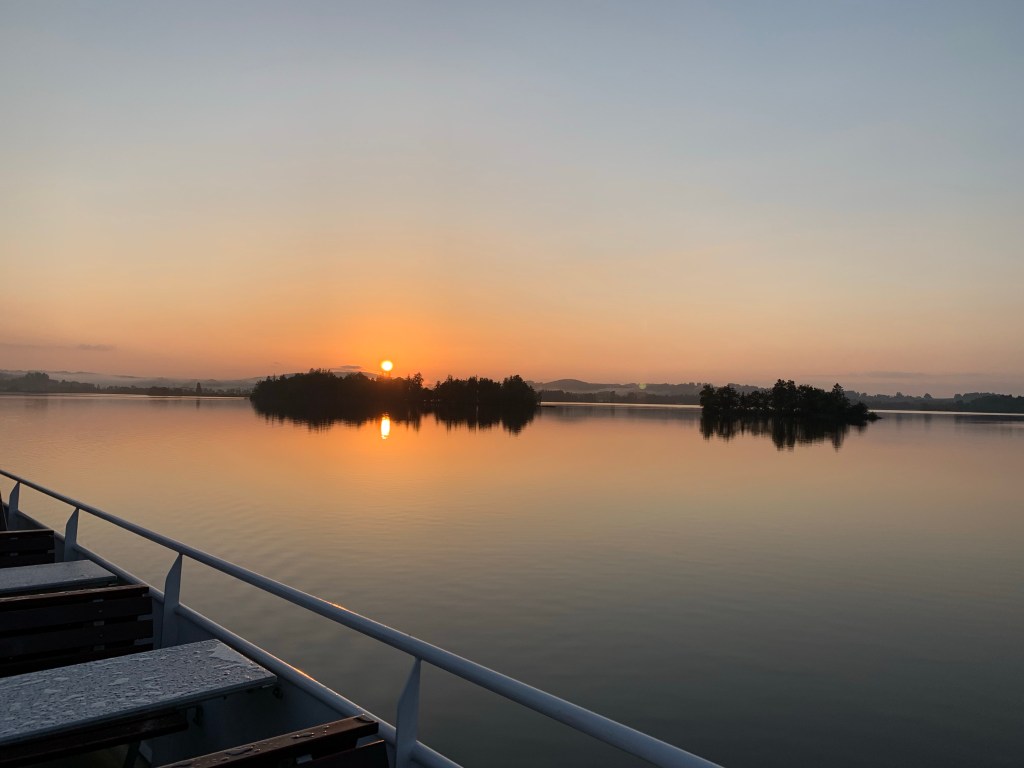 „Eigentlich ist es ziemlich bescheuert, dass ich Ihnen hier auf einem Schiff am Staffelsee etwas über Münchner Freibäder erzählen möchte….“ sage ich und denke dabei weder an das Schiff auf dem ich gerade stehe, noch an die Münchner Freibäder von denen meine erste Erzählung handelt. Ich denke, was für ein unglaubliches Glück es doch ist, dass genau jetzt, in dem Moment in dem das Schiff ablegt, die Sonne rauskommt. Die Sonne, mit der ich nach all den schlechten Wetterprognosen, gar nicht mehr rechnete, spiegelt sich wunderbar auf dem Wasser. Das sehe ich und weiß, dass ich es nicht sehen sollte, weil ich gerade zwar frei spreche, gleich aber zu lesen beginne. Es wundert mich, dass ich tatsächlich spreche und dabei an etwas anderes denke. So etwas kann nicht funktionieren und deshalb konzentriere ich mich jetzt wieder ganz auf das wunderbare Publikum und das was ich gerade erzähle. Das heißt, ich nehme es mir gedanklich vor und alleine der Vorsatz ist ja schon wieder ein neuer Gedanke –  verrückt, dass ich noch immer rede und gleichzeitig nicht das denke, was ich sage. Wenigstens sind die Gäste genauso fasziniert vom Wasser und der Sonne wie ich. Obwohl…der beste meiner Freunde schaut gerade ernst. Ok, ich habe noch nicht wirklich etwas lustiges gesagt, aber vielleicht….nein, ich habe nichts zwischen den Zähnen, weil ich nichts gegessen habe. Vielleicht schaut er deswegen ernst, weil er weiß, dass ich einen leeren Magen habe und mir – aus gerade nicht mehr nachvollziehbaren Gründen – statt einem Wasser einen Aperol Spritz zur Lesung bestellt habe. Ach gut, jetzt lächelt er. Ich auch…ist ja auch eine amüsante Stelle in meiner Erzählung…alles wieder gut. Nur mit dem Aperol muss ich vorsichtig sein. Ich lese stehend und ganz leicht spürt man die Bewegung des Schiffes. Oder des Aperols? Nein, ich hab bis jetzt nur genippt, alles gut. Jetzt ist erst mal Moses dran und ich frage mich wie ich die erste Erzählung lesen konnte und dabei an einen solchen Mist gedacht habe. Diese Art von Multitasking ist mehr als verstörend. Woran wohl Moses denkt, wenn er liest? Ich frag ihn lieber nicht. Erstens, weil er ja gerade spricht und zweitens habe ich das Gefühl, dass er nur an das denkt, was er gerade liest….faszinierend. Überhaupt ist der Mann großartig. Jetzt macht der Aperol auch Sinn. Einem so begnadetem Sprecher hört man wahnsinnig gern zu und ein Aperitif beim Sonnenuntergang rundet das ganze noch ab.