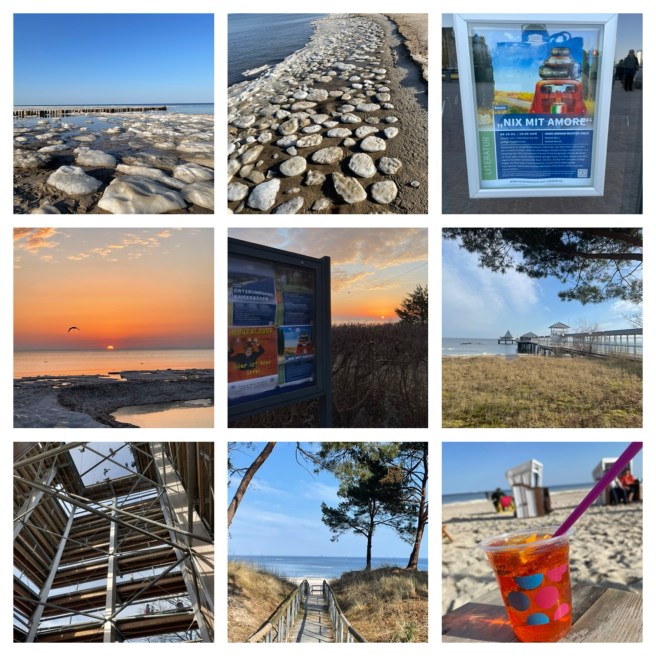 Zu dem hat Tante Mitzi mich dann später übrigens auch noch überredet. Drei Stunden vor der Lesung und nach über 30.000 Schritten am Strand, auf Seebrücken, im Wald und in Ortschaften, war ich platt und erinnerte micht daran, dass ich nicht im Urlaub sondern für eine Lesung gebucht war. Runterkommen und im Hotel alles noch einmal durchgehen, wollte ich. Wirklich. Aber ich bin die jüngere Mitzi und glaubte der alten, lebenserfahreren Mitzi, dass man einen Strand im strahlenden Sonnenschein, an dessen Ufer noch kleine Eisschollen in der Sonne funkeln, so lange wie möglich nutzen muss. Vor allem, wenn dort an einem Kiosk Aperol Spritz verkauft wird und man diesen in einem Strandkorb sitzend mit Blick auf das Meer trinken kann. Sie hatte recht – es war der vielleicht schönste Moment des Wochenendes. Und der von dem ich bei Beginn der Lesung erzählte. Wie schön es hier doch war und dass mein Traum, einmal am Meer zu lesen, gerade in Erfüllung geht. Meine Tante Mitzi saß im Publikum und ich glaube sie freute sich, dass ich mich wie sie nenne und mit fast fünfzig endlich gelernt habe, dass man sich auch alleine in ein Restaurant, ein Café oder einen Strandkorb sitzen kann und damit ganz sicher nicht seltsam wirkt. In ein paar Jahren trage ich vielleicht auch Hut. Dann bin ich noch mehr wie sie geworden. Ein bisschen schräg, ein bisschen auffällig aber auch sympathisch.