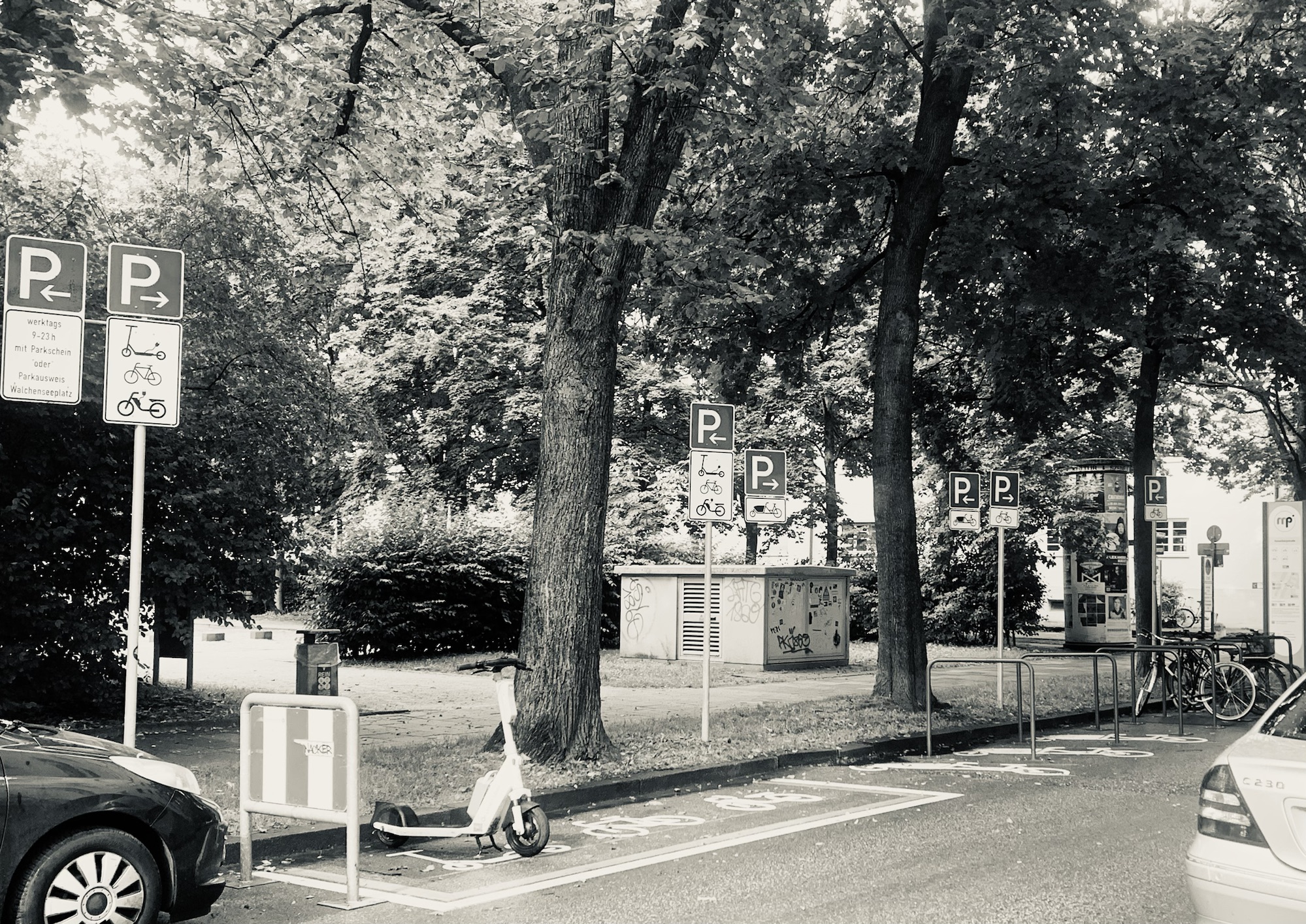 Acht (eines ist nicht mehr mit drauf) neue Parkschilder um den jeweiligen Anfang und das jeweilige Ende der Parkzone für Autos, Lasträder, normale Räder und Roller und Mofas zu kennzeichnen. Zusätzlich mit Bildern auf dem Asphalt.